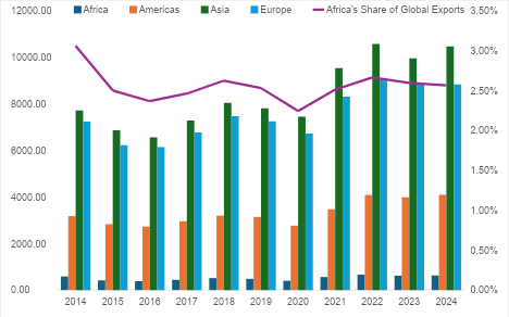Africa’s limited trade performance can be attributed in part to its heavy dependence on primary commodities such as oil, minerals, and agricultural goods, which constitute over 70% of its total exports. This reliance places the continent at the lower levels of global value chains, as it primarily exports raw materials while importing higher-value finished goods. The narrow and undiversified export structure also increases the continent’s exposure to global price fluctuations and external economic shocks.